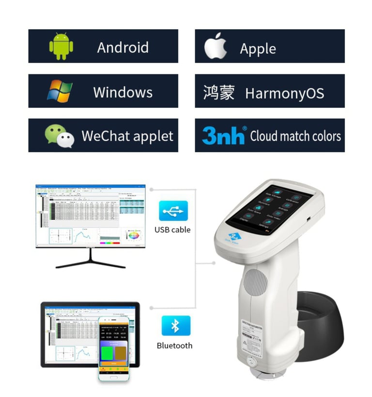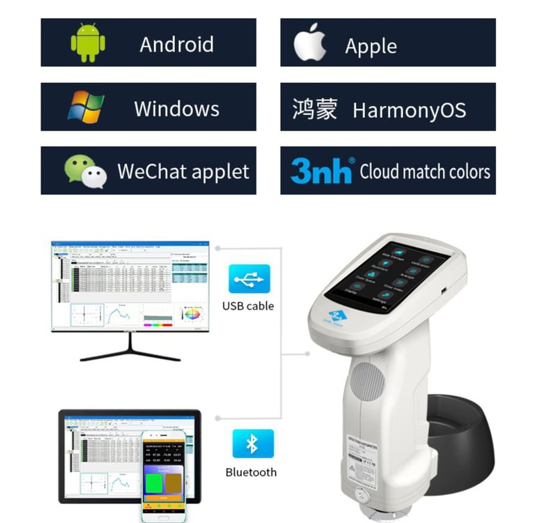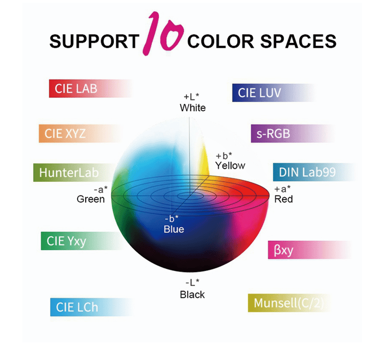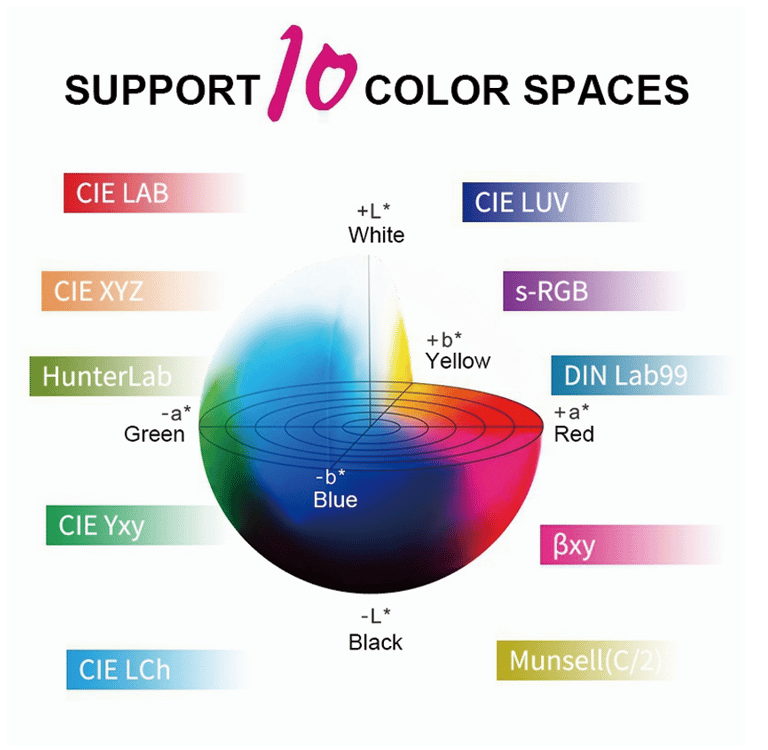 Offer CIE LAB, XYZ, Yxy, LCh, CIE LUV, S-RGB, HunterLab, βxy, DIN Lab99, Munsell(C/2) color spaces, and D65, A, C, D50, D55, D75, F1, F2(CWF), F3, F4, F5, F6, F7(DLF), F8, F9, F10(TPL5), F11(TL84), F12(TL83/U30), B, U35, NBF, ID50, ID65, LED-B1, LED-B2, LED-B3, LED-B4, LED-B5, LED-BH1, LED-RGB1, LED-V1, LED-V2, LED-C2, LED-C3, LED-C5. It also can costumized light source (A total of 41 of light source, Partially realize through the PC software / APP software), and can meet the special measurement requirements under different measurement conditions.