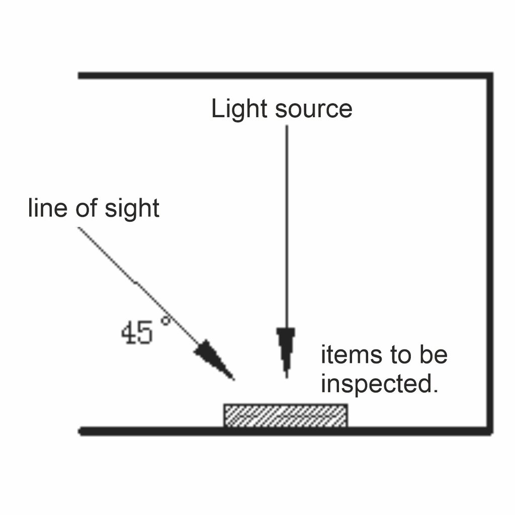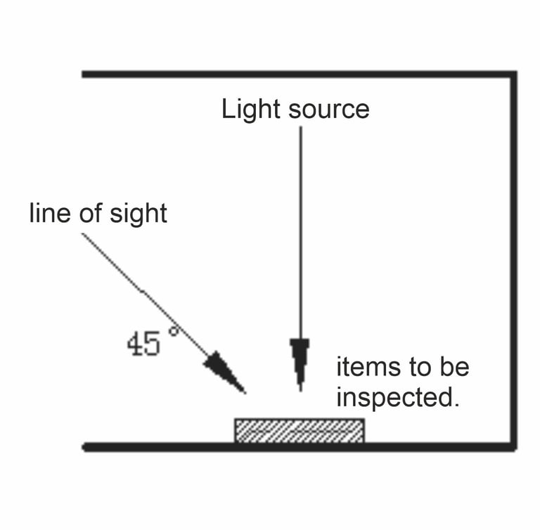 The T90-7-AW light box is specically designed for color evaluation and accurate checking of color deviations in industrial production. Therefore, it should be placed in the optimal assessment environment. The work surface and surrounding areas should be of a neutral color with low gloss. External light interference should be avoided, and external light should not directly shine on the opening of the observation chamber. After the light tubes have been on for 20-30 minutes, the color temperature, color rendering index, and illuminance reach their optimal states. The items to be inspected should be placed in the center of the light box baseboard. When comparing the colors of two or more items, they should be placed side by side and close together. The observation angle should ideally be with the light source at 90° and the line of sight at 45°. The light source should shine vertically onto the items being inspected, and the observer should look at them from a 45° angle