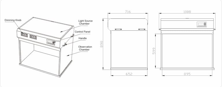 The T90-7-AW light box mainly consists of several parts: the observation chamber, the light source chamber, the control panel, the dimming knob, and the handle. It is used for accurately matching the color deviations of products and is widely applied in color-related fields such as textiles, dyeing, printing, plastics, pigments, paints, coatings, and photography. The control section employs a programmable text controller and a PLC for operation, making it more convenient for operators to use. It allows free switching between different light sources and displays the usage times and duration for each light source, both of which can be reset to zero.