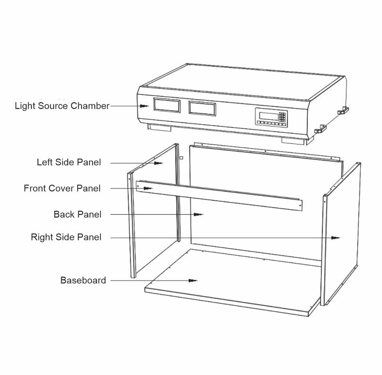 The components of the light box include:the light source chamber,baseboard,back panel,right side panel,left side panel,and front cover.M4 screws are also provided. The installation steps are as follows:
