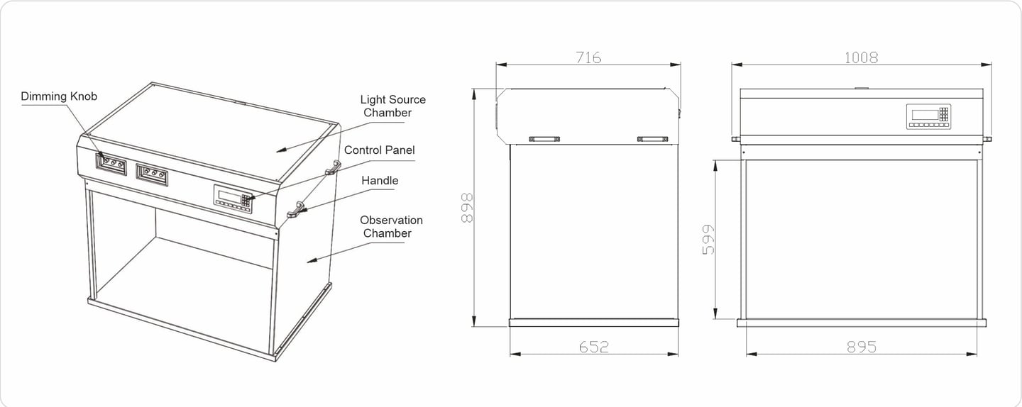 The T90-7-AW light box mainly consists of several parts: the observation chamber, the light source chamber, the control panel, the dimming knob, and the handle. It is used for accurately matching the color deviations of products and is widely applied in color-related fields such as textiles, dyeing, printing, plastics, pigments, paints, coatings, and photography. The control section employs a programmable text controller and a PLC for operation, making it more convenient for operators to use. It allows free switching between different light sources and displays the usage times and duration for each light source, both of which can be reset to zero.