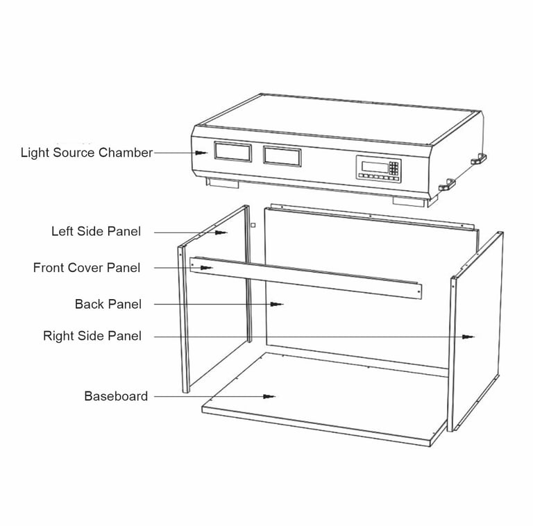 The components of the light box include:the light source chamber,baseboard,back panel,right side panel,left side panel,and front cover.M4 screws are also provided. The installation steps are as follows: